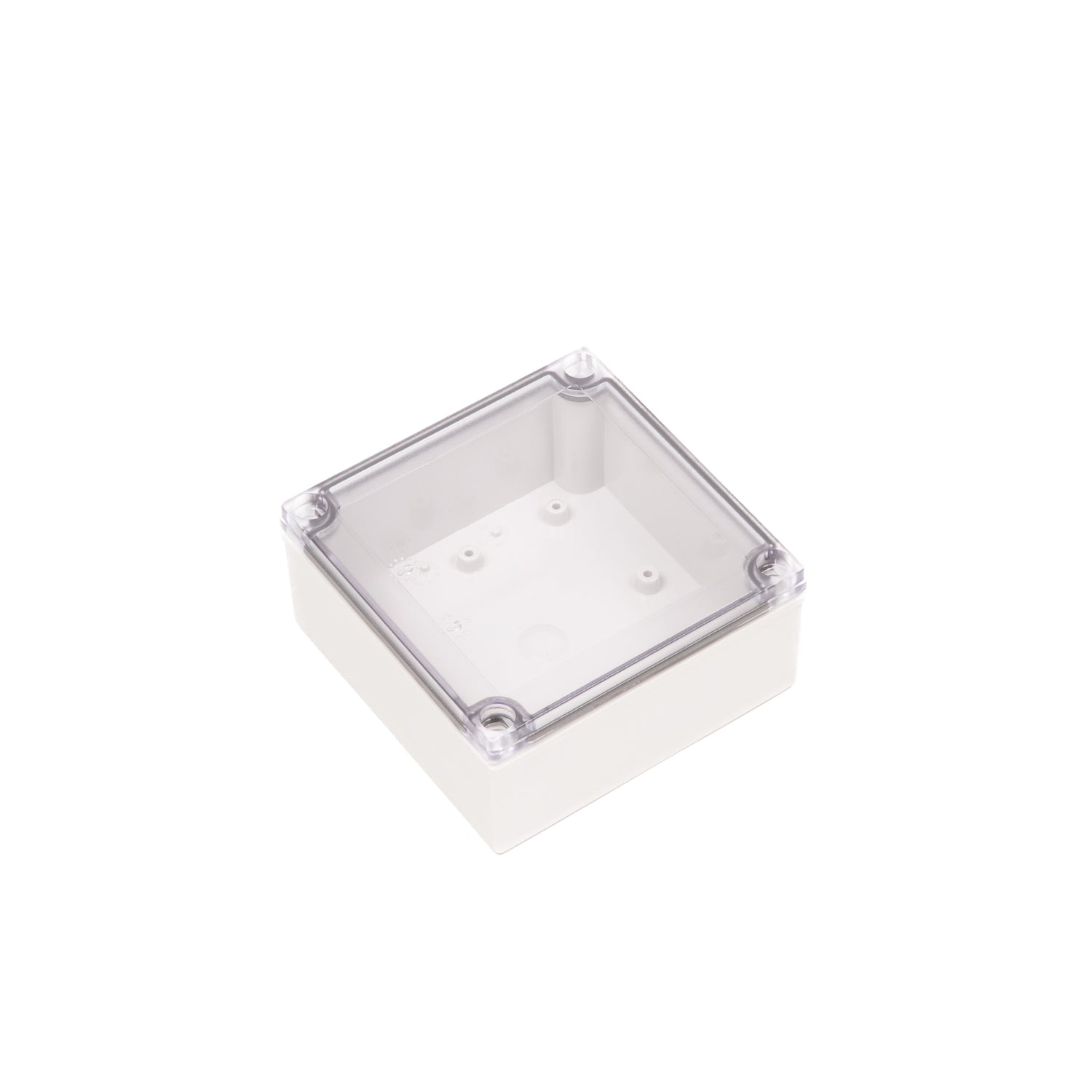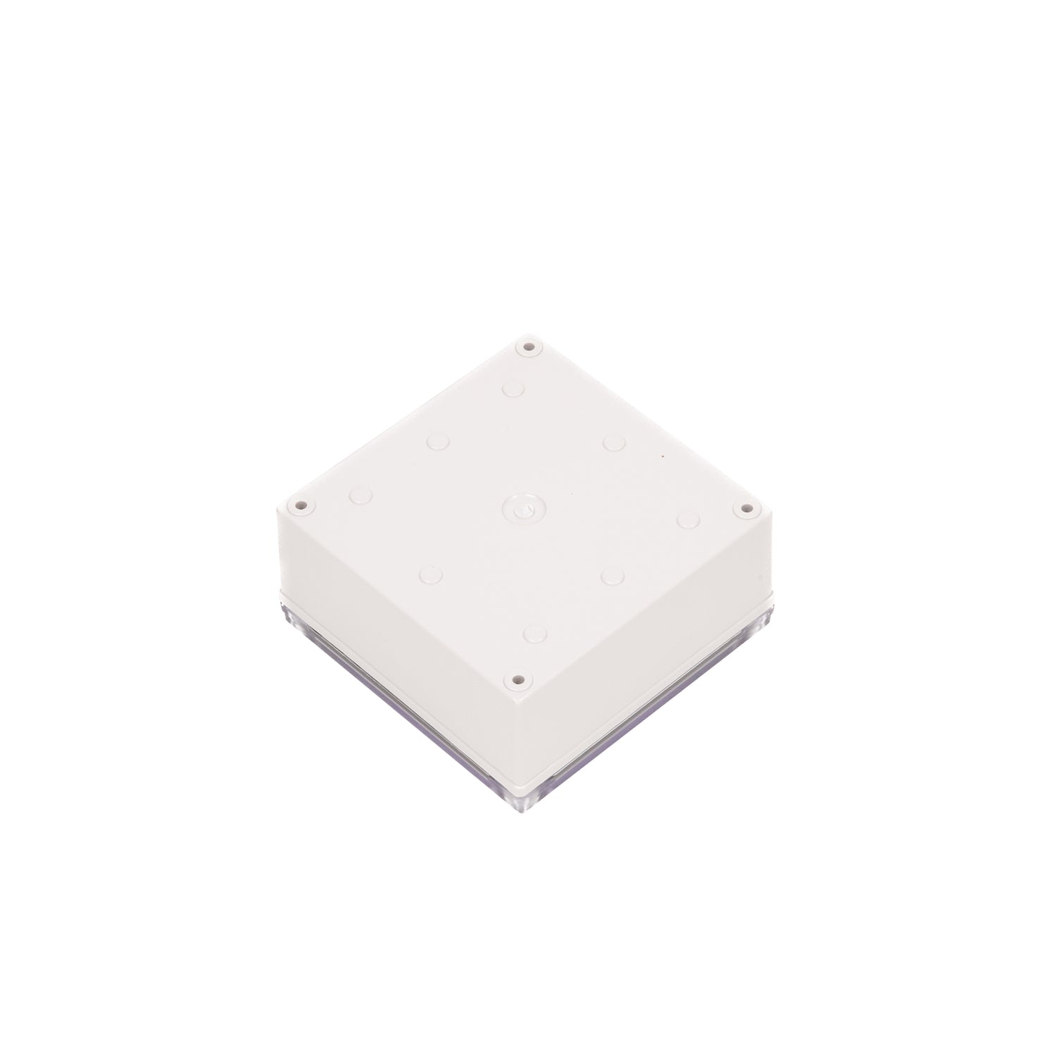 This model measures 5.12 x 5.12 x 2.36 inches, which is 130 x 130 x 60 mm. It is a plastic enclosure in the Boxco M-Series with a transparent cover and screw-type recessed lid.