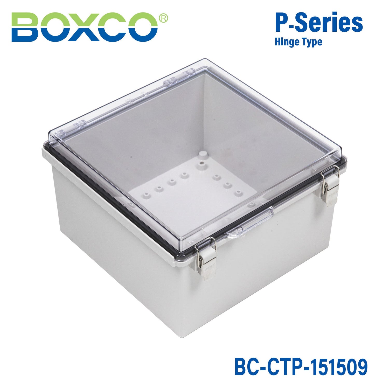 Boxco P-Series 5.91 x 5.91 x 3.54 Inches(150 x 150 x 90mm) Plastic Enclosure, IP67, IK08, PC, Transparent Cover, Molded Hinge and Latch Type