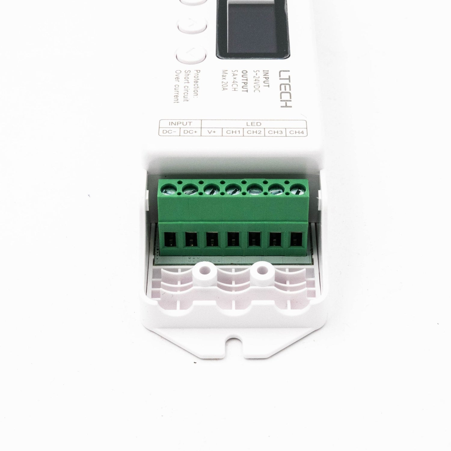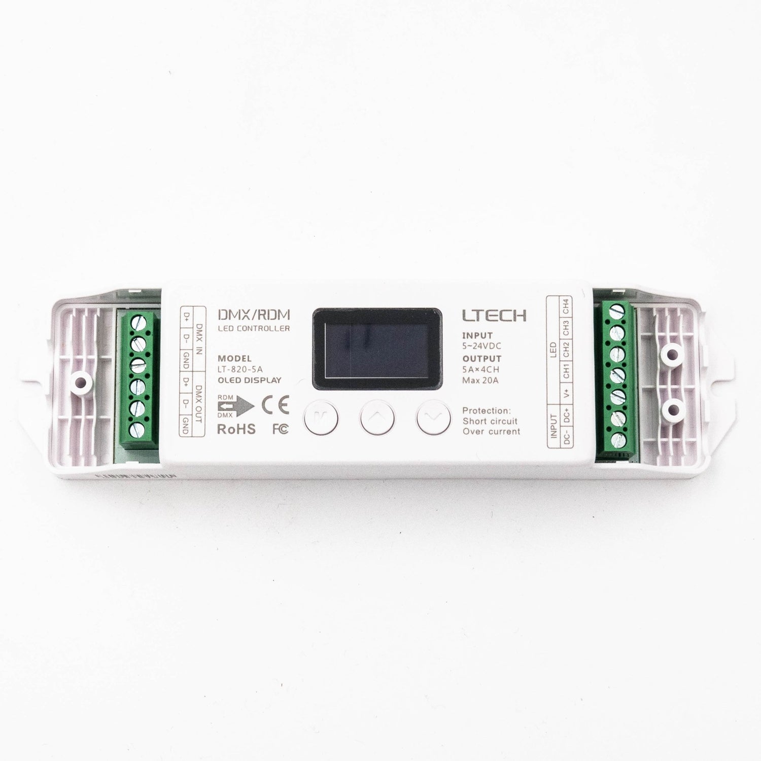 This DMX LED controller is suitable to controll constant voltage LED, rated from 5 to 24 Volts. The controller is capable of 16 or 8 bit dimming and has a handy digital screen where you can easily set and read the DMX start address.