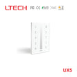 The UX5 LED Dimmer Touch panel gives you the opportunity to easily Dim your LED lights. You can select the brightness by moving your finger over the bar in the middle. In addition, the UX5 has four zones. You can save your setting with the buttons I or II. The UX5 sends a DMX or a 2.4GHz RF signal. Through the DMX signal it can be controlled by connecting DMX controllers. DMX controllers which can be used for this are the LT-801-12A or LT-811-12A. Via the 2.4GHz RF signal it can be wirelessly controlled, here you connect the UX5 with R4-5A or R4-CC receiver. When using PWM Constant Voltage LED lighting you need the LED Receiver R4-5A and when using Constant Current lighting, you need the R4-CC, where you have the choice of 350mA / 700mA / 1050mA control. The UX5 can collaborate via RF 2.4GHz with the V5 remote, making it possible to operate remotely as well as manually. Via a WiFi signal, it is possible to connect the UX5 with the WiFi-104. This makes it possible to control via the app on your phone or tablet. The UX5 has a universal backplate for all kind of wall boxes.