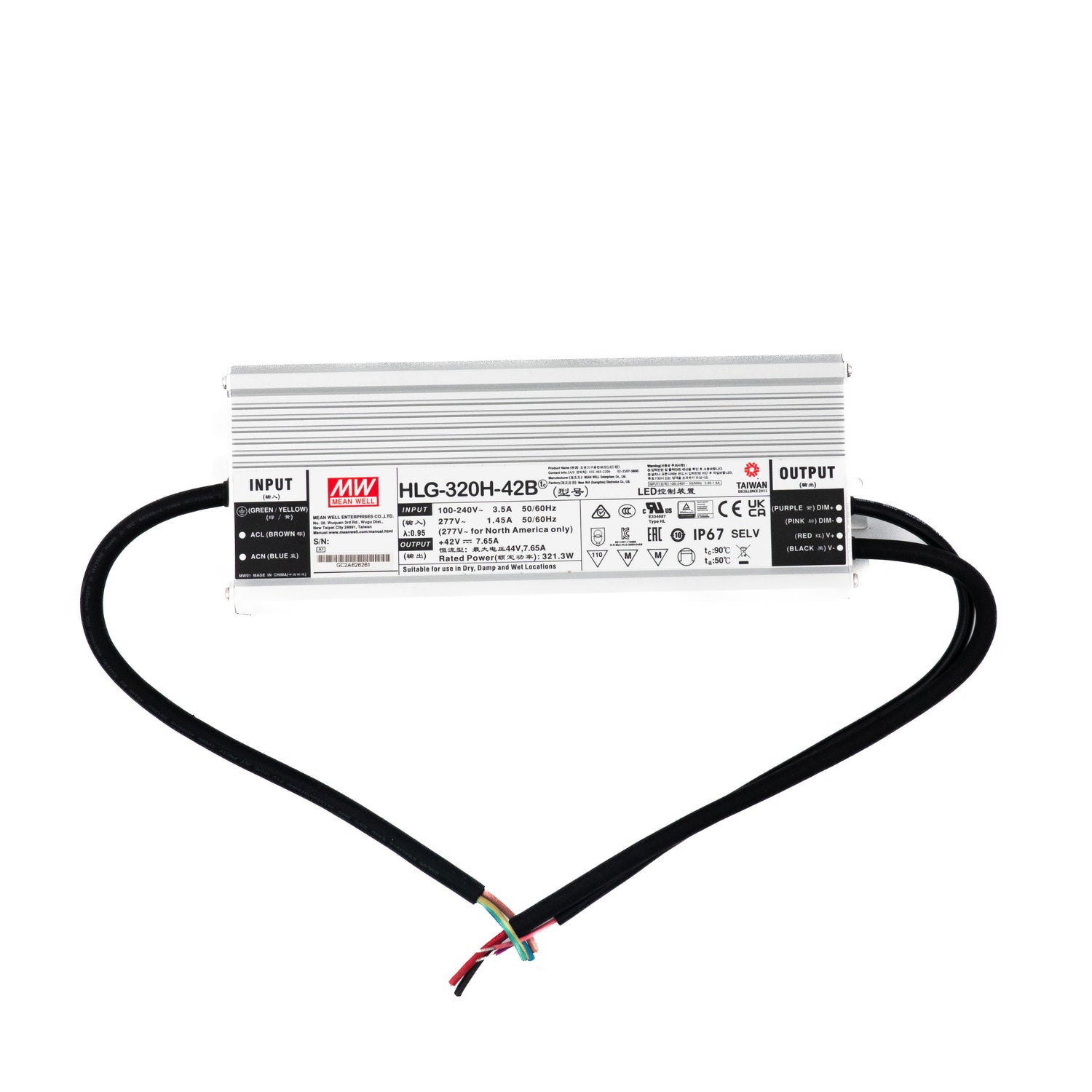 Yes. With 320W of output at 42V, it can handle large channel-letter arrays or cabinet signs. The IP67 rating makes it reliable in fully exposed outdoor sign installations, and its wide 90-305VAC input accommodates varying commercial mains voltages worldwide.